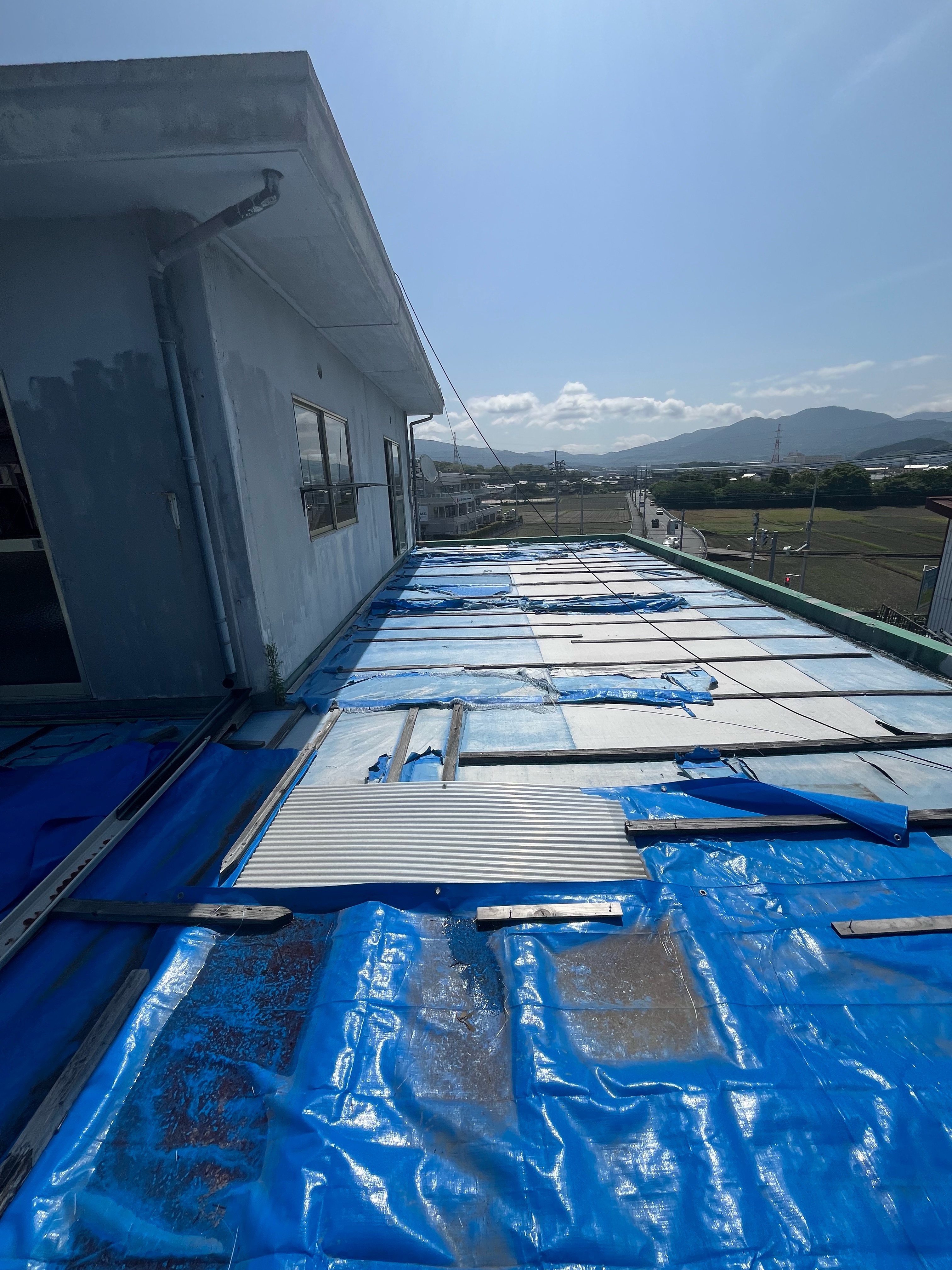 以前のパラペット屋根の上には、雨漏りしたのか?ブルーシートが前面に敷かれていました。