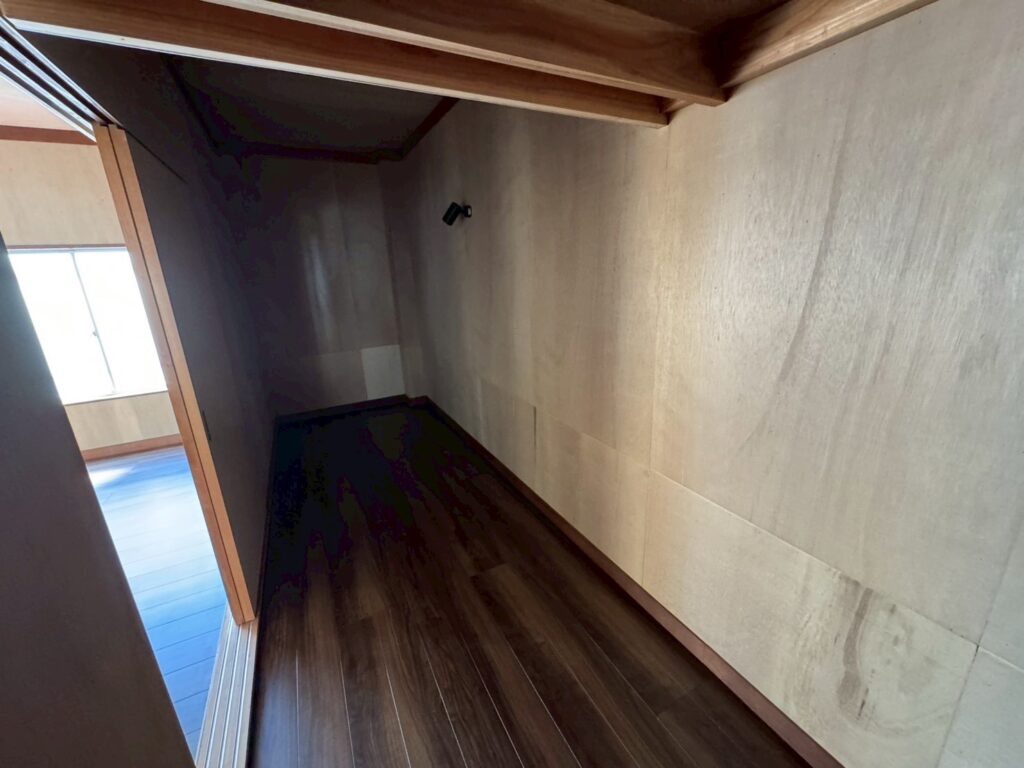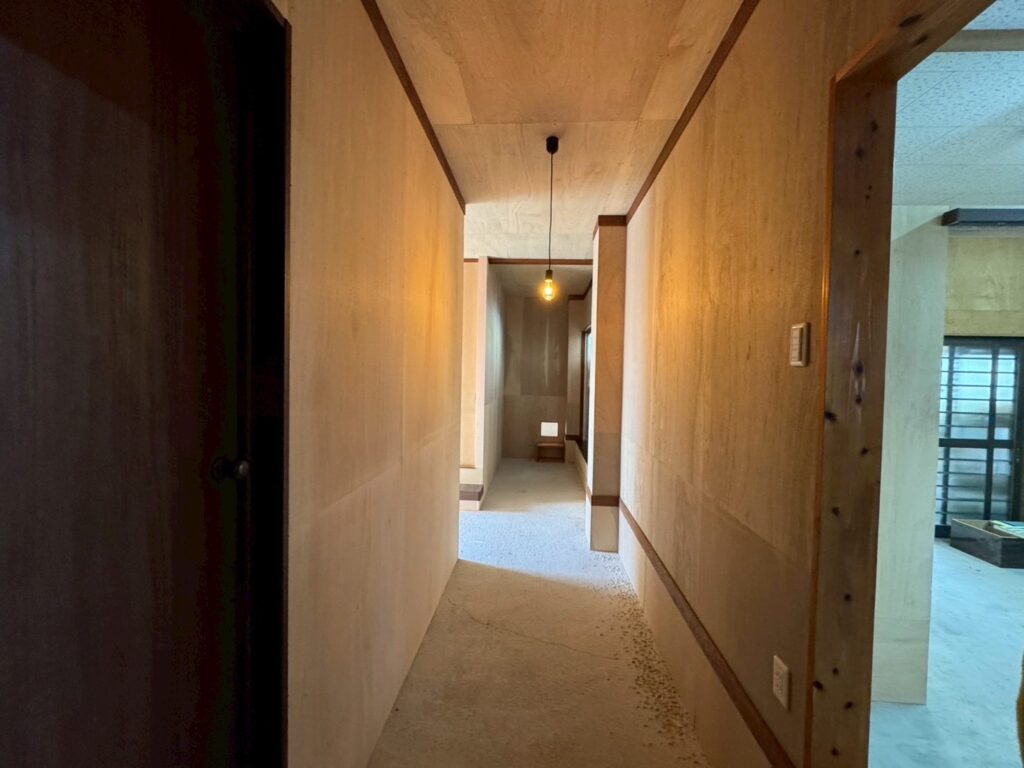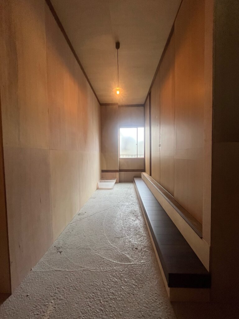二つのお部屋の間の通路。ダンジョン感満載でお施主様もお喜びです。きっと猫ちゃんたちも走り回って楽しそうです。奥の小さい開口は猫ちゃんたちのお部屋への出入り口です
