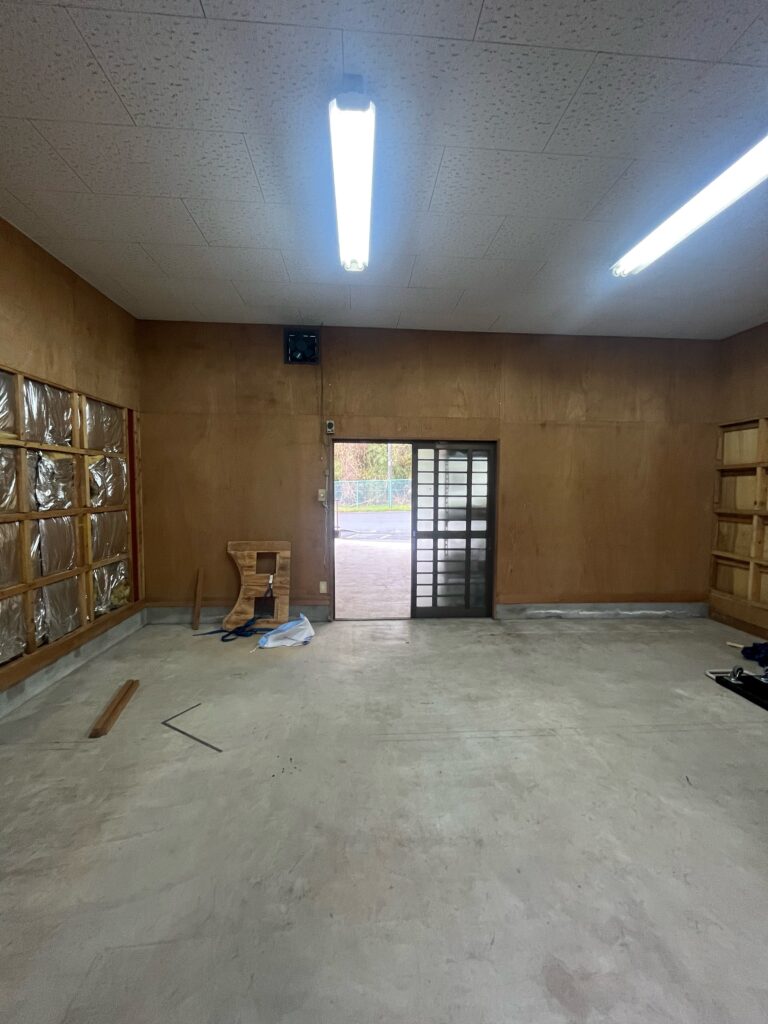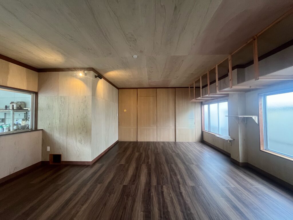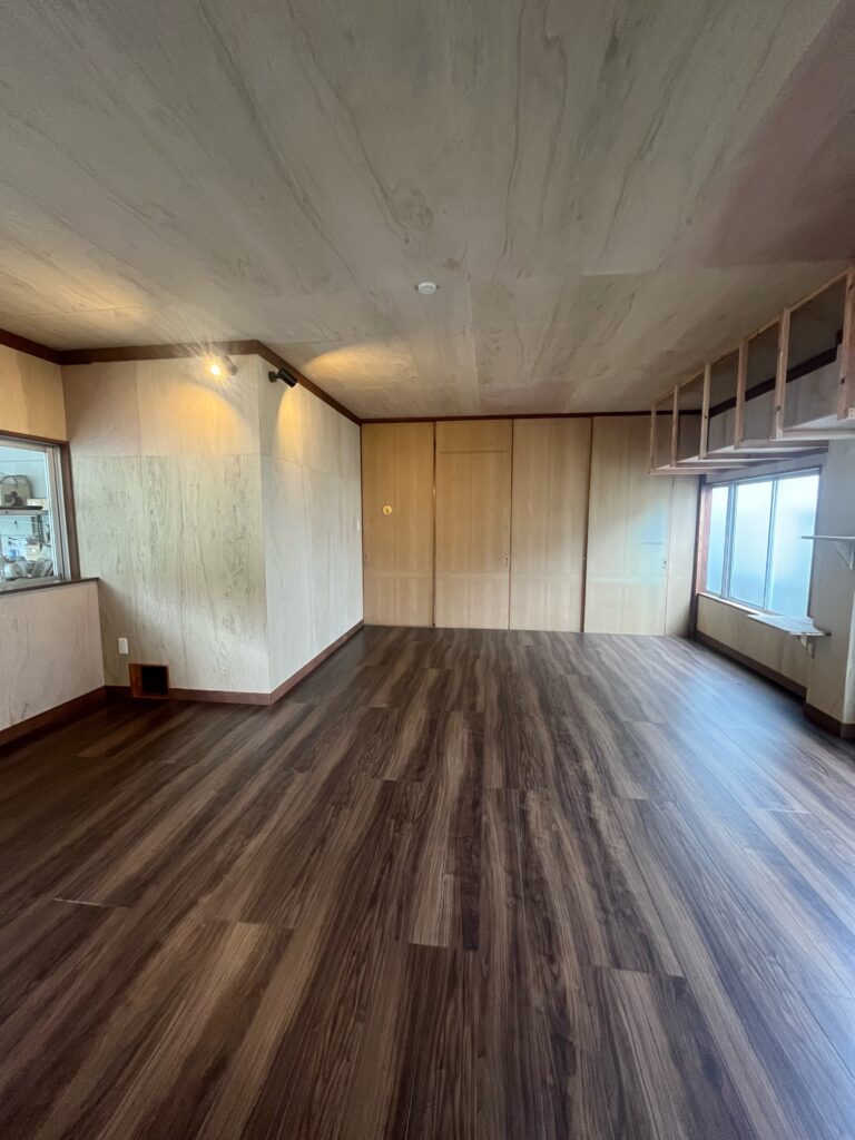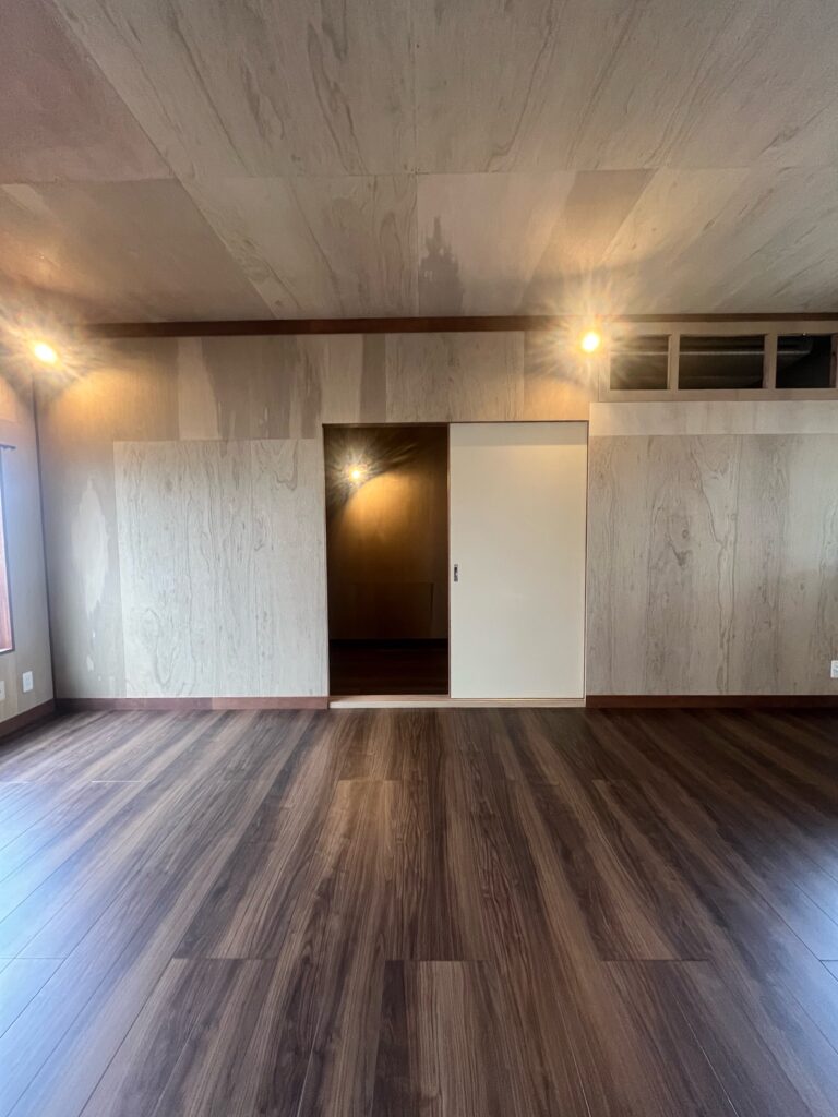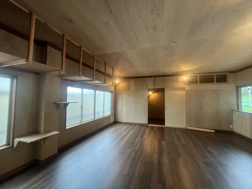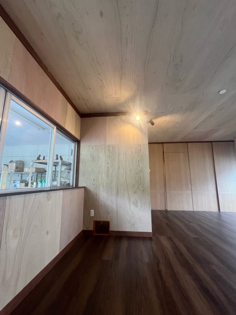 元々大きな作業場だったスペースを猫ちゃんたちといっしょに暮らすお部屋に大改造しました。あと、猫ちゃんの習性を考慮して、お部屋の壁や天井をガリガリ対策で「ラワンべニア」で仕上げました。これが時間の経過と共に、いい雰囲気に木が焼けたら味のあるお部屋になるだろうな~~