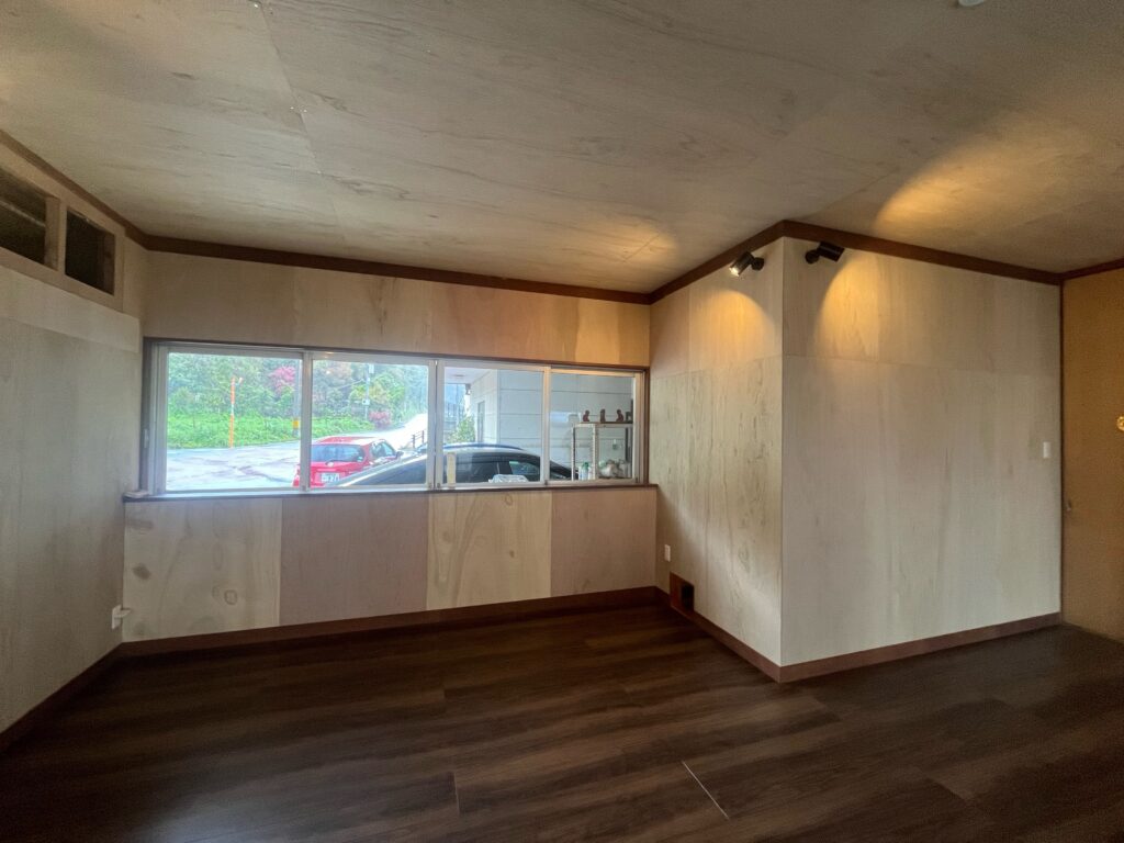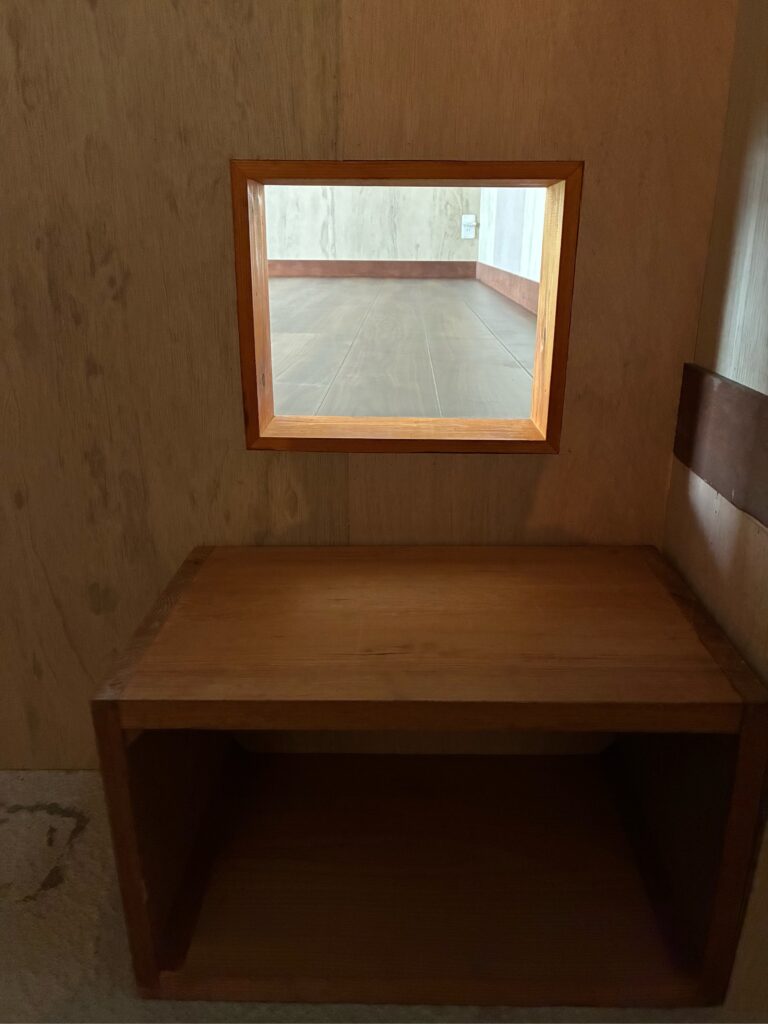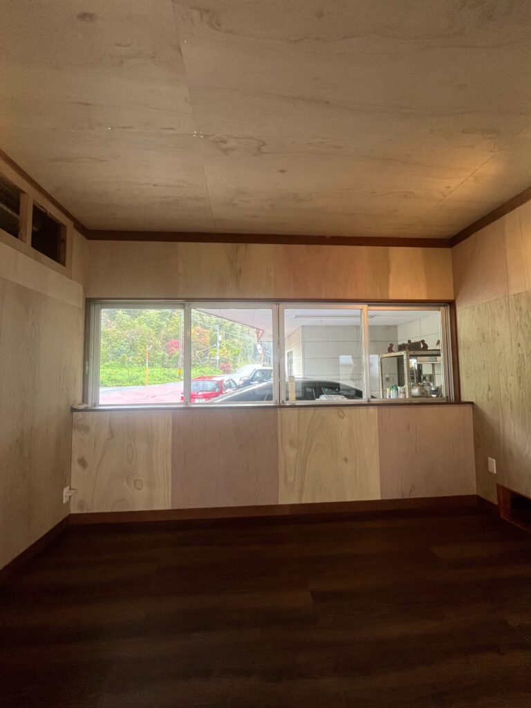 元々の窓部分に腰壁をたてて、猫ちゃんたちの物見台になりました。あと、大工さんがラワン材を使い分けて貼ってくれました。左上の「エアコン吹き出し口」には、猫ちゃんたちが間違えて入らないように工夫しています。