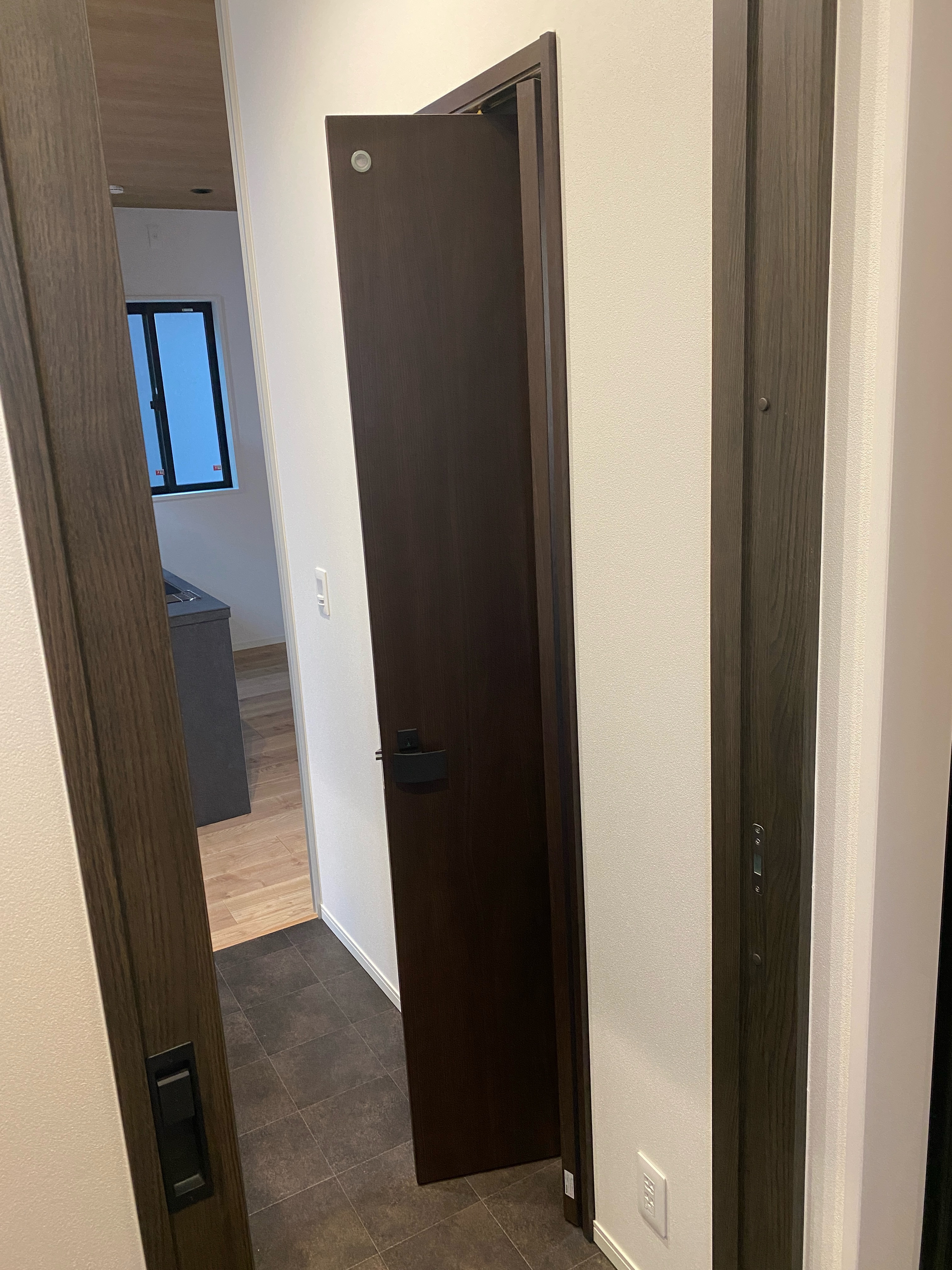 ドアを開くとこのように折れながら右側吊元まで寄るので、出入りに余裕もあり、手前通路にも余裕ができます。